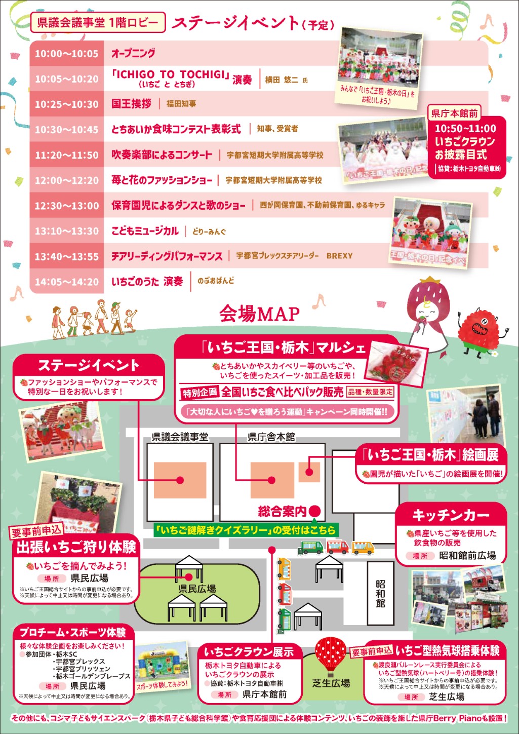県内外たくさんの方にいちごを楽しんでもらおうと、毎年1月15日前後の週末に合わせ、栃木県庁で記念イベントが開催されています。