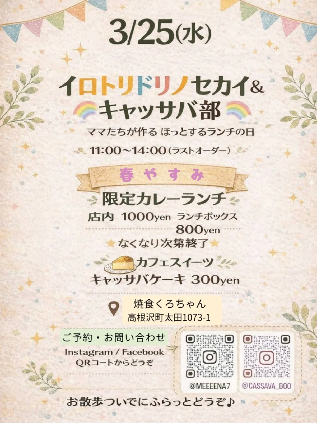 ご予約はキャッサバ部さん、イロトリドリノセカイさん各インスタのDMでお願いします。