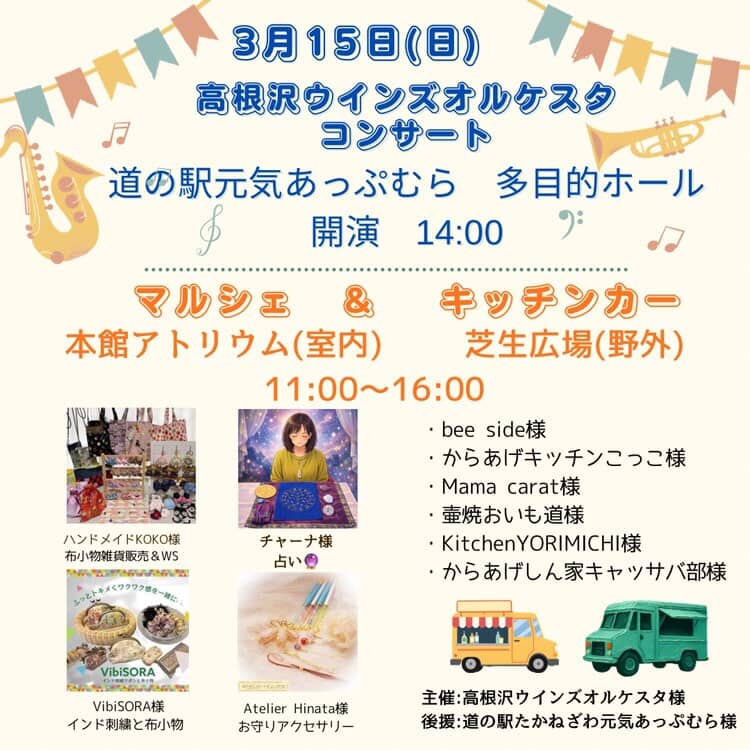 また、コンサート当日は同駅で11:00〜16:00にマルシェ&キッチンカーも多数出展予定です。