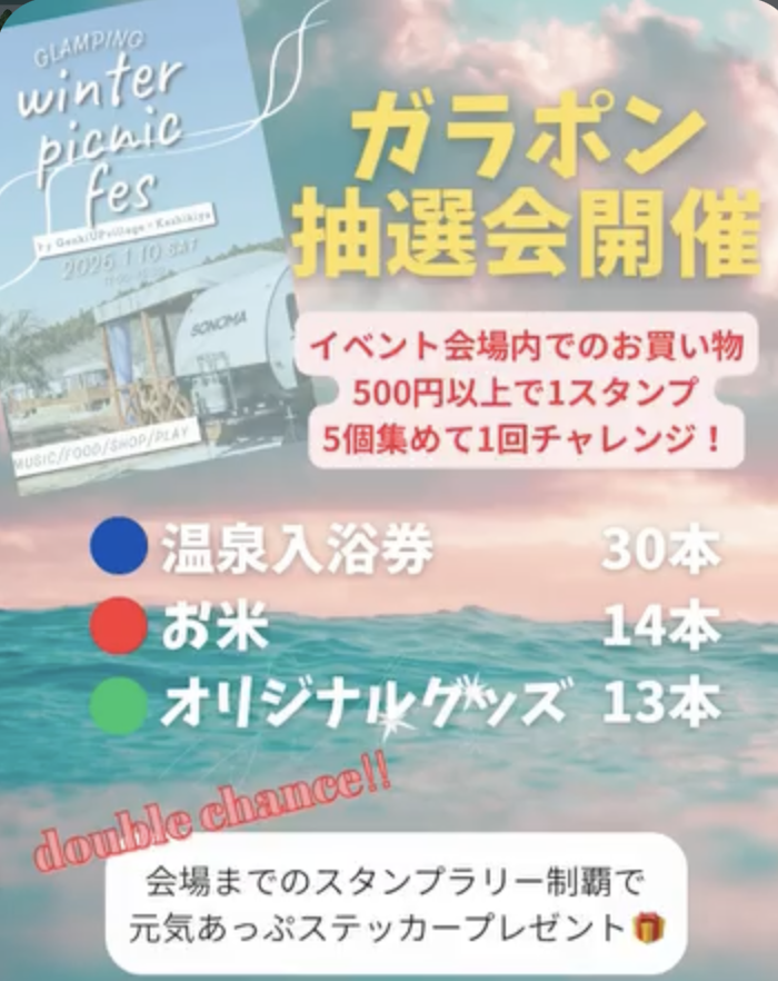 本館からグランピング施設まえでスタンプラリーを実施、またお買い物をするとガラポン抽選に参加できます。