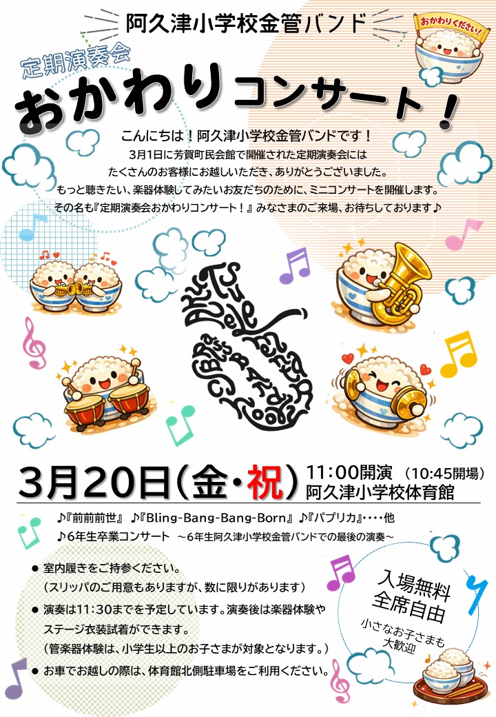 3/20(金・祝) 阿久津小学校金管バンド「定期演奏会 おかわりコンサート!」