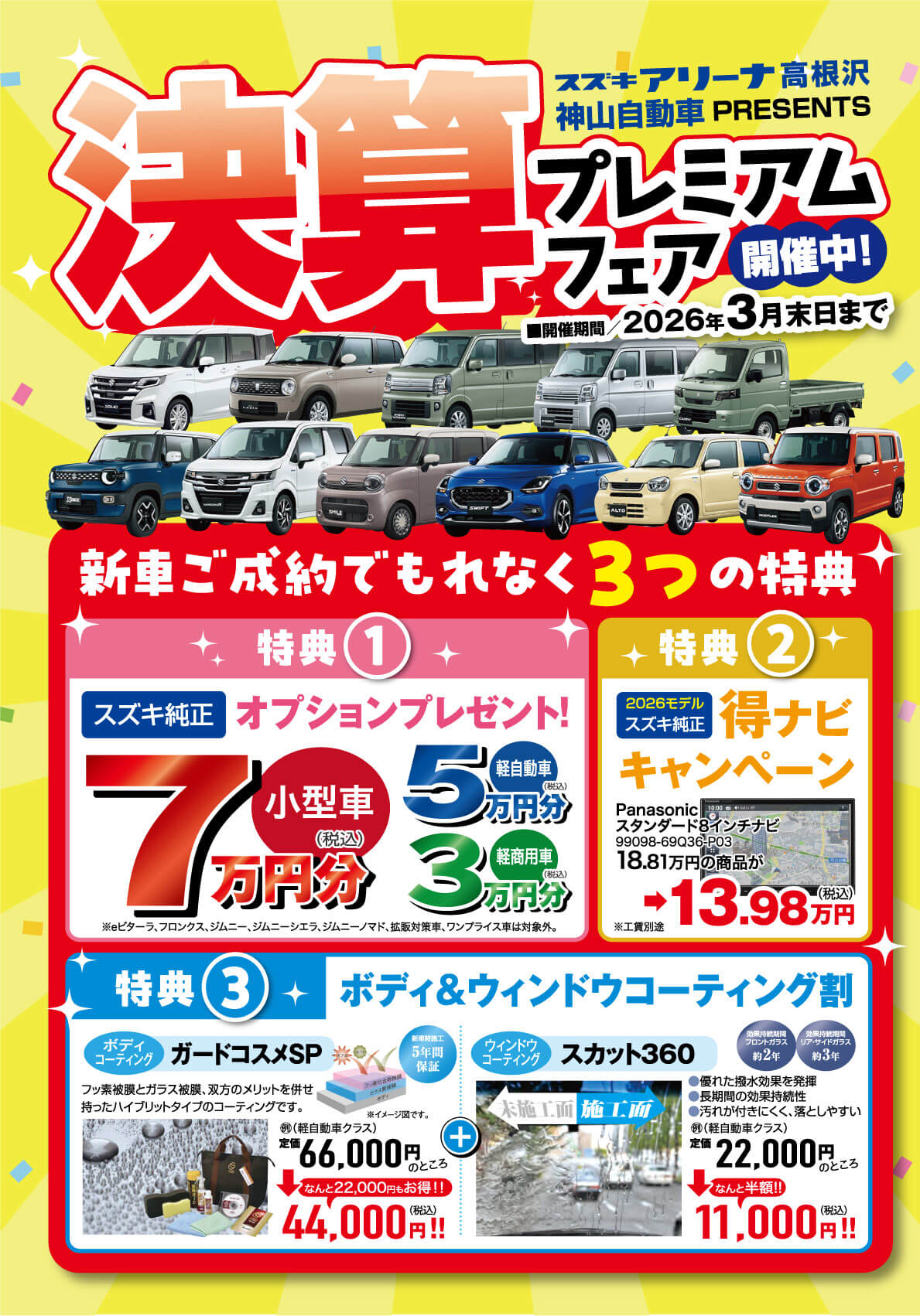 車選びに、ぜひスズキアリーナ高根沢・神山自動車さんの「決算プレミアムフェア」へおでかけください!