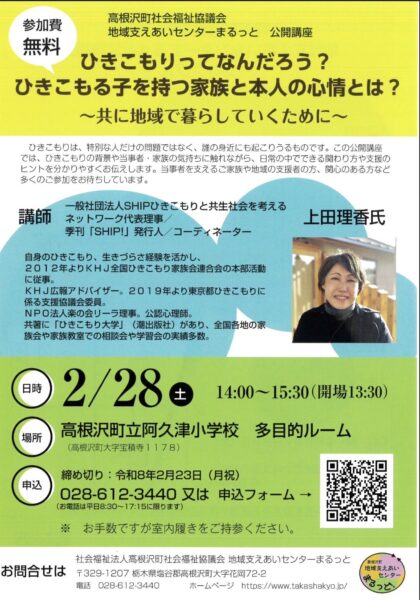 2/28(土) 地域支えあいセンターまるっと公開講座「ひきこもりってなんだろう? ひきこもる子を持つ家族と本人の心情とは?」