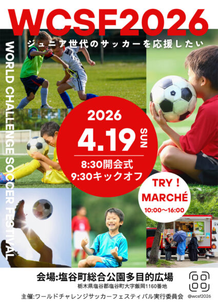 WCSF2026サッカー大会(9:00〜)をメインイベントとして、会場では「TRY!MARCHÉ」が同時開催(10:00〜16:00)。