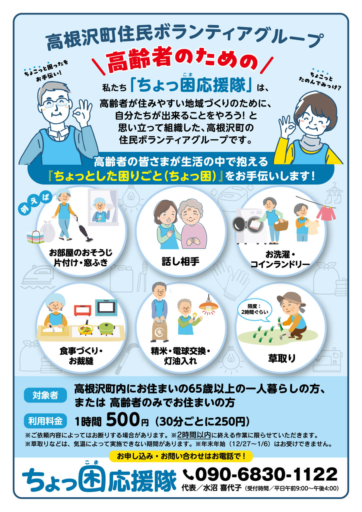 高齢者などのお宅の “ちょっとした困りごと” (庭の草取り、灯油入れの手伝い、電気交換など)を低料金で請け負う、町住民有志の団体です。
