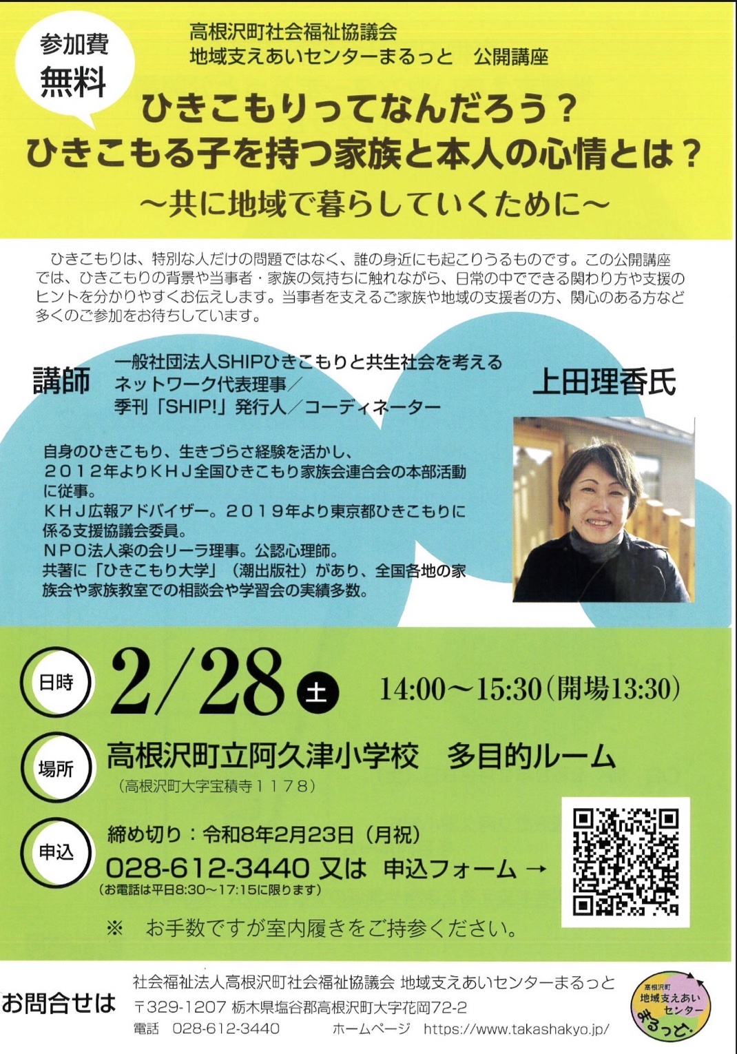 高根沢町社会福祉協議会内にある、複合した相談を受け止める総合相談窓口・「地域支えあいセンター まるっと」で、ひきこもりへの理解を深めるための公開講座を、2/28(土)に阿久津小学校で開催、現在参加者を募集しています。
