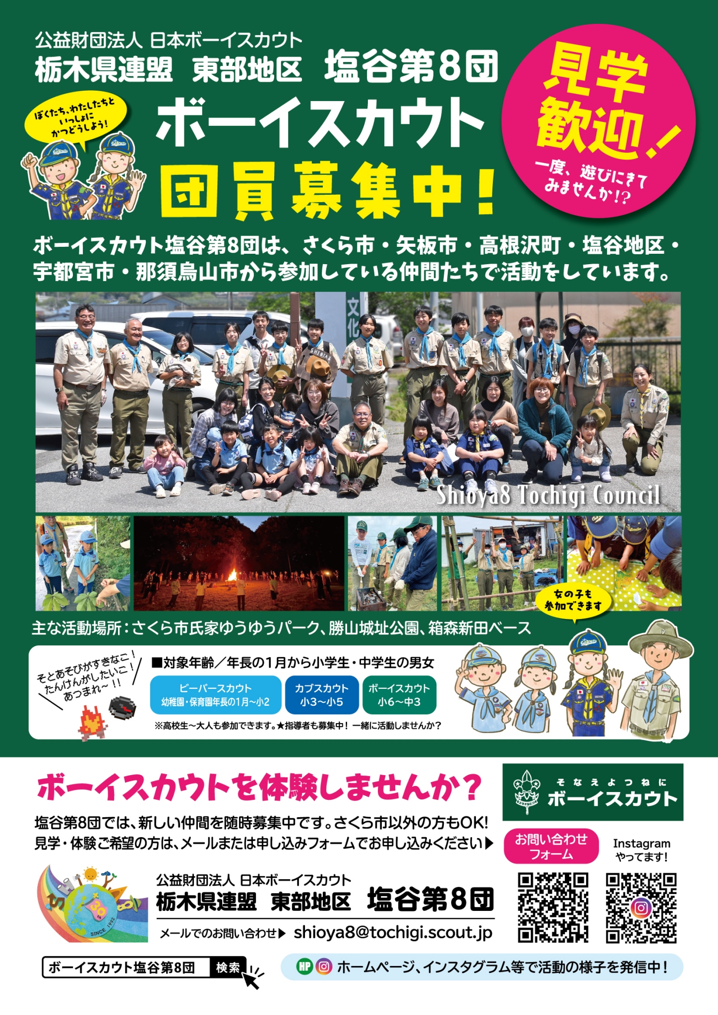 気になる方は、チラシのQRコードまたは、「ボーイスカウト塩谷第8団」で検索して、申込みフォームまたはメール(shioya8@tochigi.scout.jp)まで、申し込んでください。