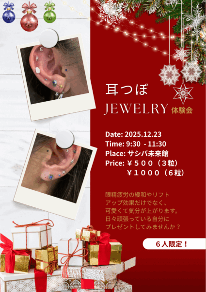 さらに、クリスマス企画ということで、今回は同時開催で「耳つぼジュエリー」の体験会もやるそうです。