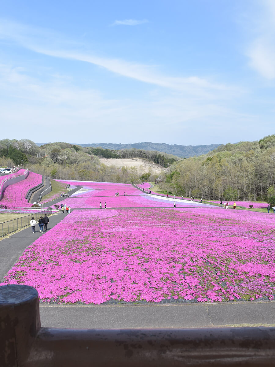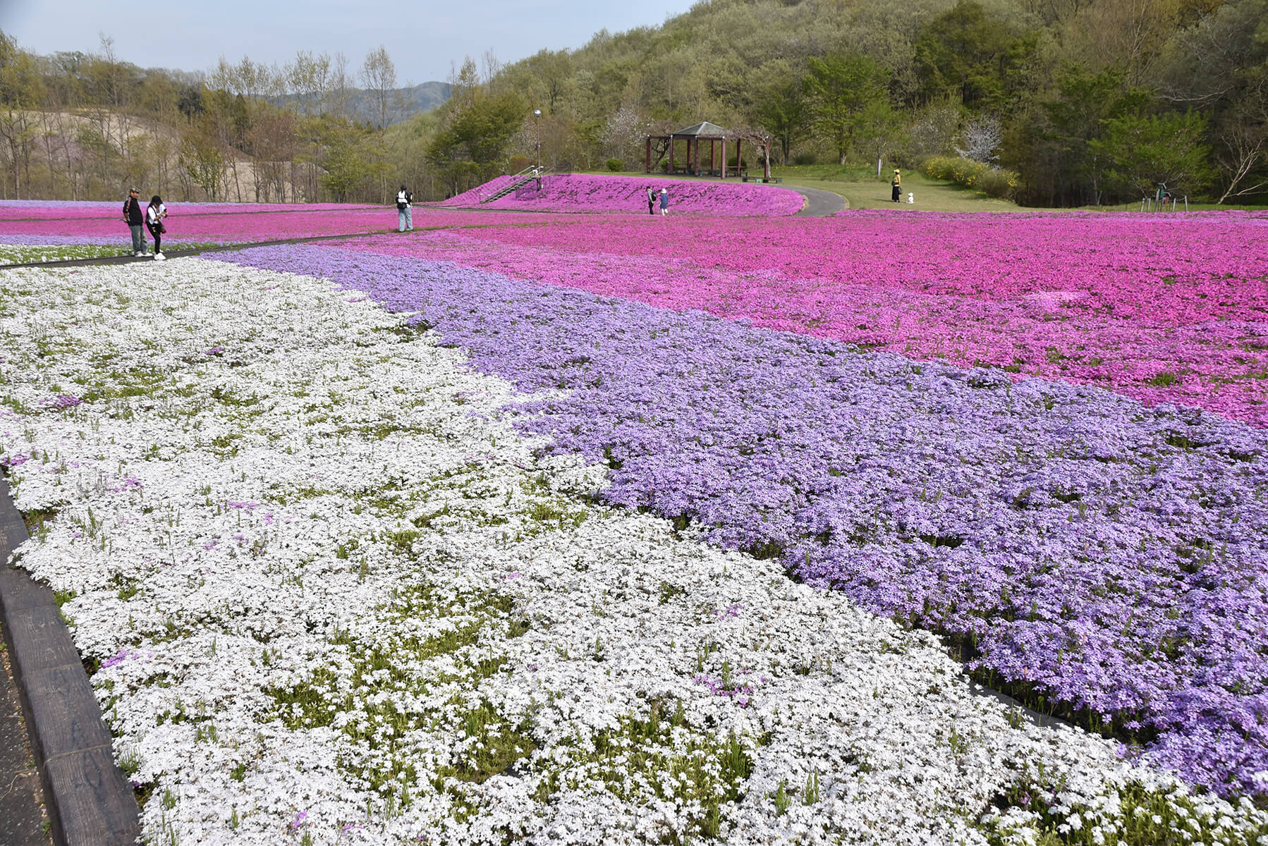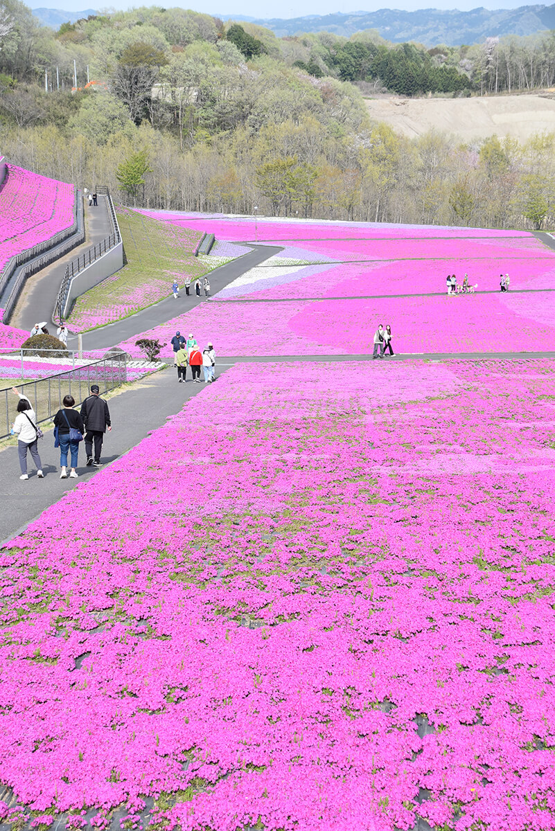 広さ18,000㎡の小高い丘には白色、紫、淡いピンク、濃いピンク4色の芝ざくら約28万株が植栽され、敷地いっぱいに鮮やかな花を咲かせています。