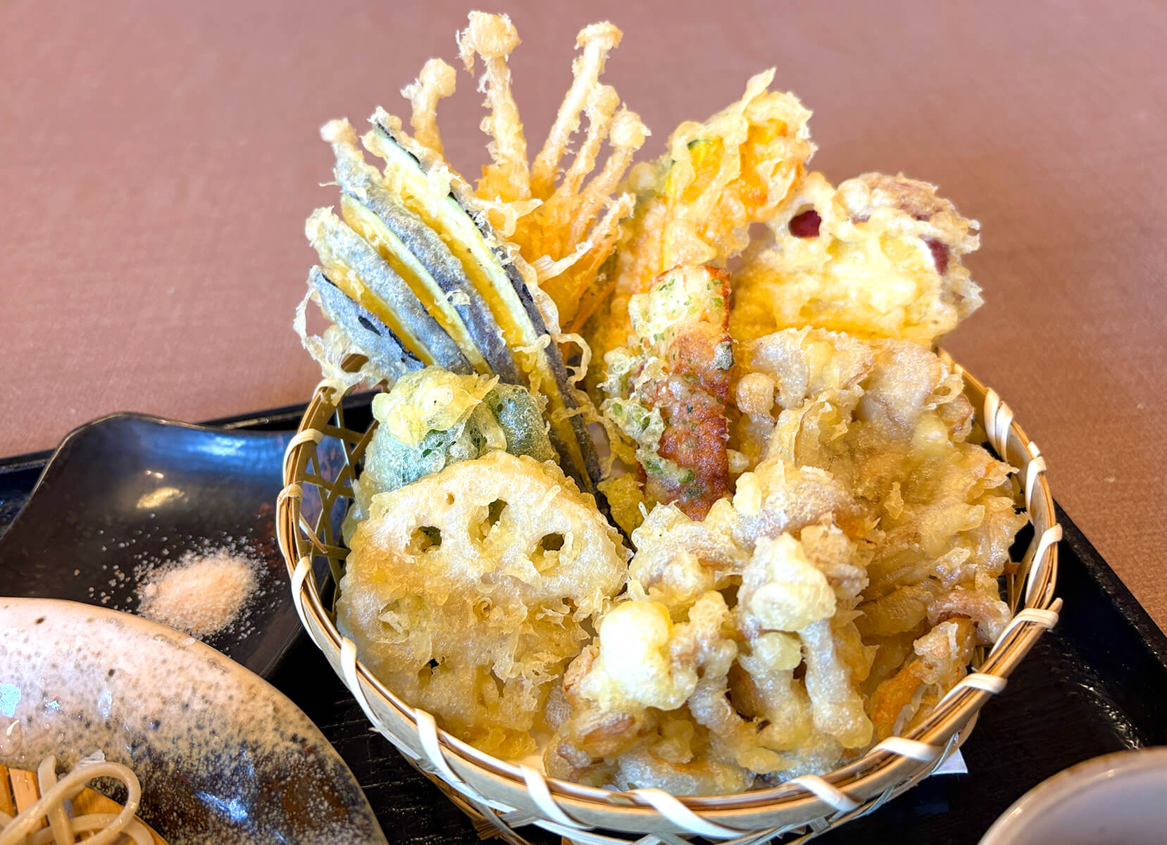 ナス、かぼちゃ、サツマイモ、れんこん、ピーマン、舞茸、しめじ、えのき、そしてちくわ・・9種類の天ぷらがたっぷり盛られていて、かなりのボリュームがあります。